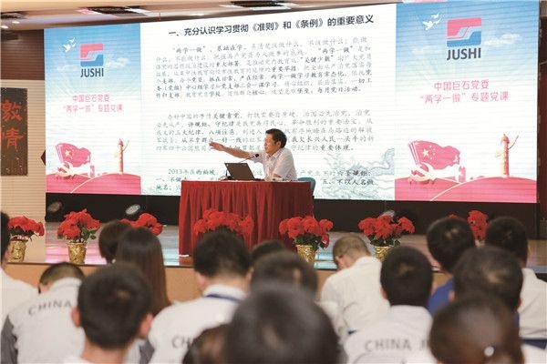 為迎接黨的十九大召開,推進(jìn)兩學(xué)一做學(xué)習(xí)教育常態(tài)化制度化,9月21日上午,中國巨石黨委組織黨員和干部參加"兩學(xué)一做"專題黨課。中共中國巨石黨委副書記周省霖,黨委委員楊國明、曹國榮和各支部書記、委員,全體中層干部共300多位同志一起學(xué)習(xí)。